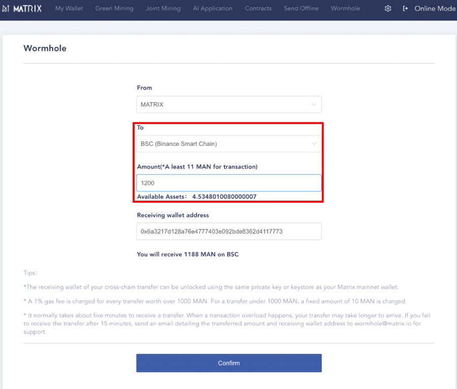DeFi and NFT are gaining ground. In order to increase the liquidity of digital assets, and to cooperate with more NFT projects, Matrix AI Network is officially releasing the Wormhole Cross-chain Bridge, currently supporting only official web wallets, and opening it up to BSC (Binance Smart Chain) as our first step. This article shows you how to transfer your assets cross-chain to BSC.