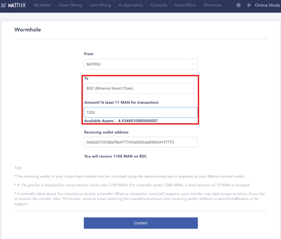 3. Enter the number of MAN you wish to transfer back to Matrix Mainnet from BSC.