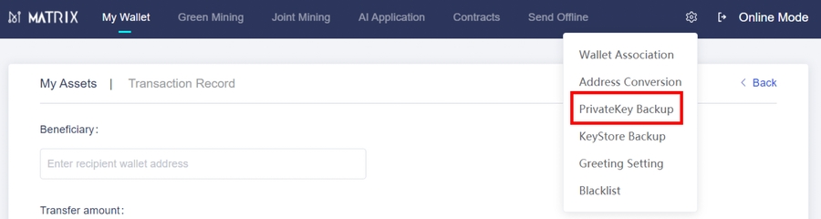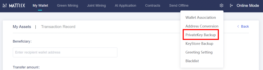 b. The beneficiary wallet is a mirror wallet of your Matrix Mainnet wallet created on BSC. This wallet can be unlocked using the same private key or keystore as your Matrix Mainnet wallet.