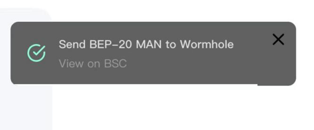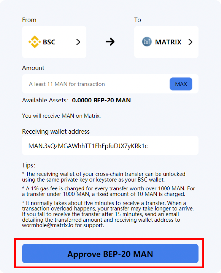 Note: The minimum amount for a cross-chain transfer is 11 MAN, while the upper limit is slightly lower than your total wallet balance.