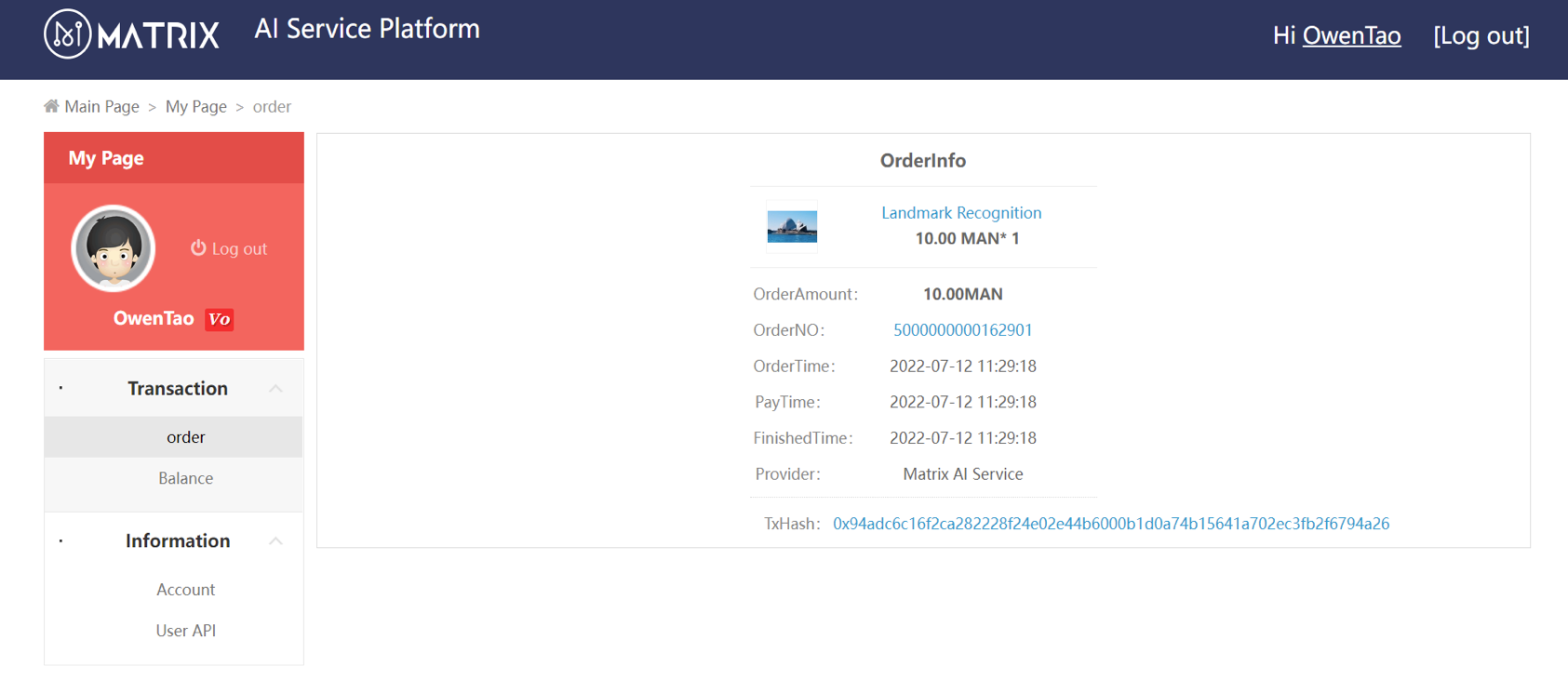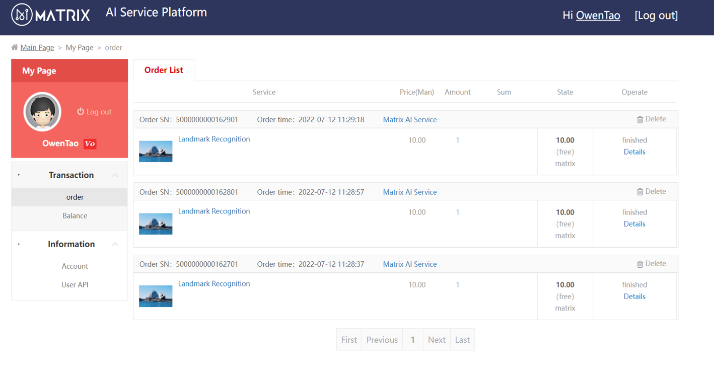 Users will have access to all their order history, whether they have used services directly or through API. By clicking Details, they may also check their transaction information that is stored on the blockchain.