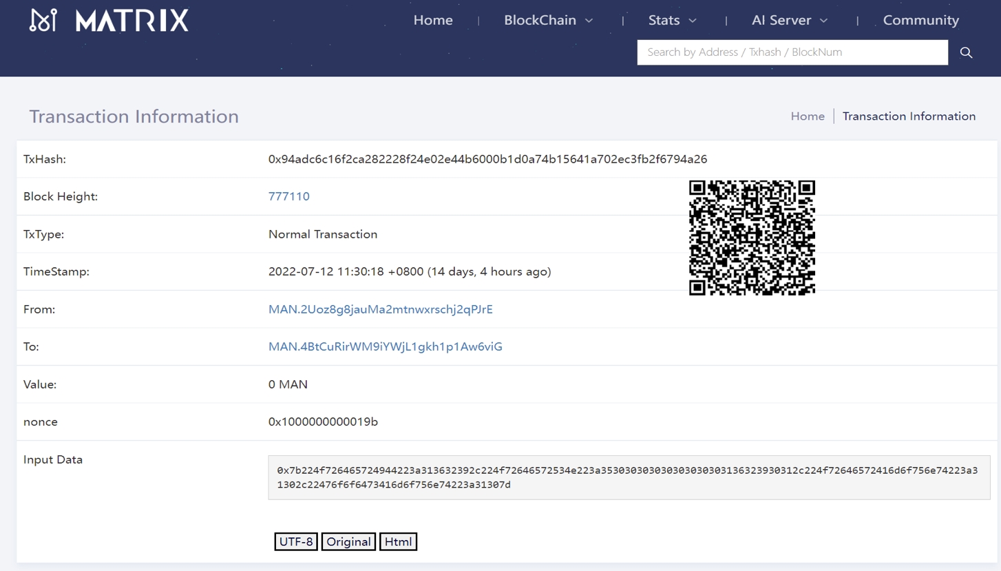Click hash to view the corresponding transaction on-chain. The blockchain stores the core information of each order users make.